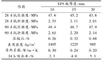 隨著EPS板厚度的增大,輕骨料混凝土復合隔熱磚抗壓強度、抗折強度降低,壓縮比增大,表觀密度,導熱系數降低,24h吸水率增大。EPS板的厚度宜控制在15-20mm范圍。