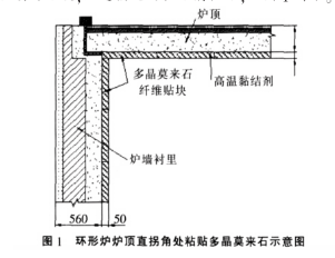 (7)爐頂直拐角處粘貼多晶莫來(lái)石纖維貼塊,應(yīng)將爐頂?shù)馁N塊伸到爐墻原爐襯里,用爐墻的貼塊支撐爐頂?shù)馁N塊,且連接處用黏結(jié)劑粘貼,如圖1所示。