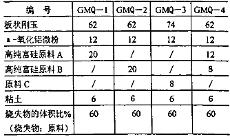 由于雜質(zhì)含量對剛玉-莫來石制品的高溫性能影響很大,所以在配料中應(yīng)盡量選擇(Al2O3+SiO2)高而其他雜質(zhì)含量少的原料,試驗(yàn)選用高純板狀剛玉砂、α-Al2O3微粉、高純富硅原料,以粘土做結(jié)合劑。主要原料的性能見下表1
