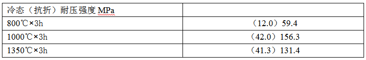 為了探索莫來石在復合膠結劑中形成的溫度,我們作了如下試驗,對1#試樣的生坯分別以800℃×3h,1000℃×3h和1350℃×3h燒后測其冷態強度,結果如下: