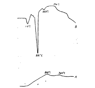 由上述數據中冷態強度的突變可以認為:莫來石約在1000℃時形成,這也可以用熱力學計算加以證明,例如γ-Al2O3與無定形SiO2之間形成莫來石的△G900k已為-38.2千焦。而α-Al2O3與無定形SiO2之間形成莫來石的△G1100k則為-0.26千焦。也就是說,α和γ-Al2O3只要充分活化后滿足動力學條件,則分別可以在827℃和327℃就能形成莫來石了。但是由圖2的1000℃×3h燒后的試樣中并不能觀察到晶態莫來石的存在,對此,我們認為:在如此低的溫度下,雖然莫來石可以形成,但由于擴散量很小,所以形成的初生態或非化學計算莫來石并不能長大成為足以觀察到的莫來石晶體,但卻已發揮了其較大的結合強度,為了進一步證實我們這一推測,我們對A、B兩種復合膠結劑分別作了差熱分析、其差熱曲線如圖3所示;