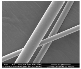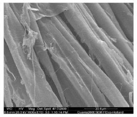 圖1和圖2分別是打漿后的植物纖維和硅酸鋁纖維的掃描電鏡照片。