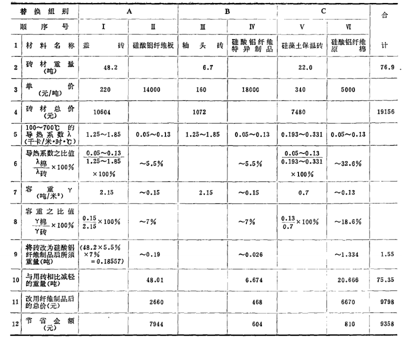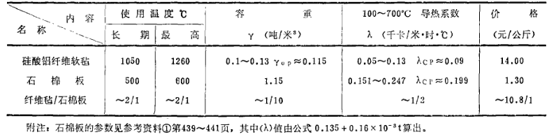 一、采用硅酸鋁纖維軟氈代替石棉板,這兩種材料的主要參數(shù)及價(jià)格列于表4: