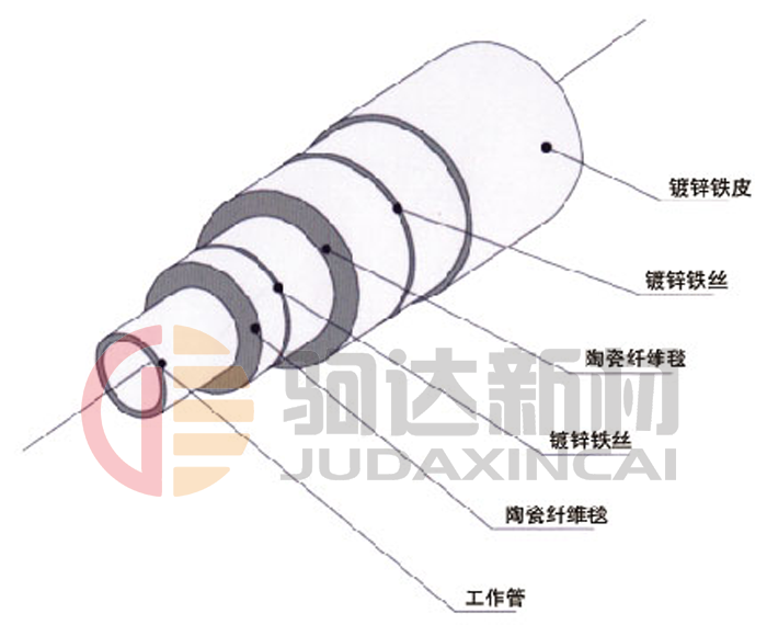 金屬保護層可根據實景情況選材,一般采用玻璃絲布、玻璃鋼、鍍鋅鐵皮、油氈、鋁皮等。要求纏繞后的陶瓷纖維毯包裹堅實,無空隙和漏縫。